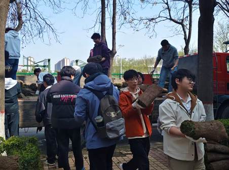 活动现场,后勤管理处的园林师傅向同学们讲解了草坪铺设的技巧、土壤翻松的要点以及后期养护的注意事项。听完讲解后,同学们干劲十足、热情高涨,铲土、铺草、浇水,分工协作、配合默契,每一滴汗水都折射出青春的担当与奋斗的底色。经过三个多小时的协同努力,裸露的土地被整齐的草皮覆盖,校园一角焕发出勃勃生机。